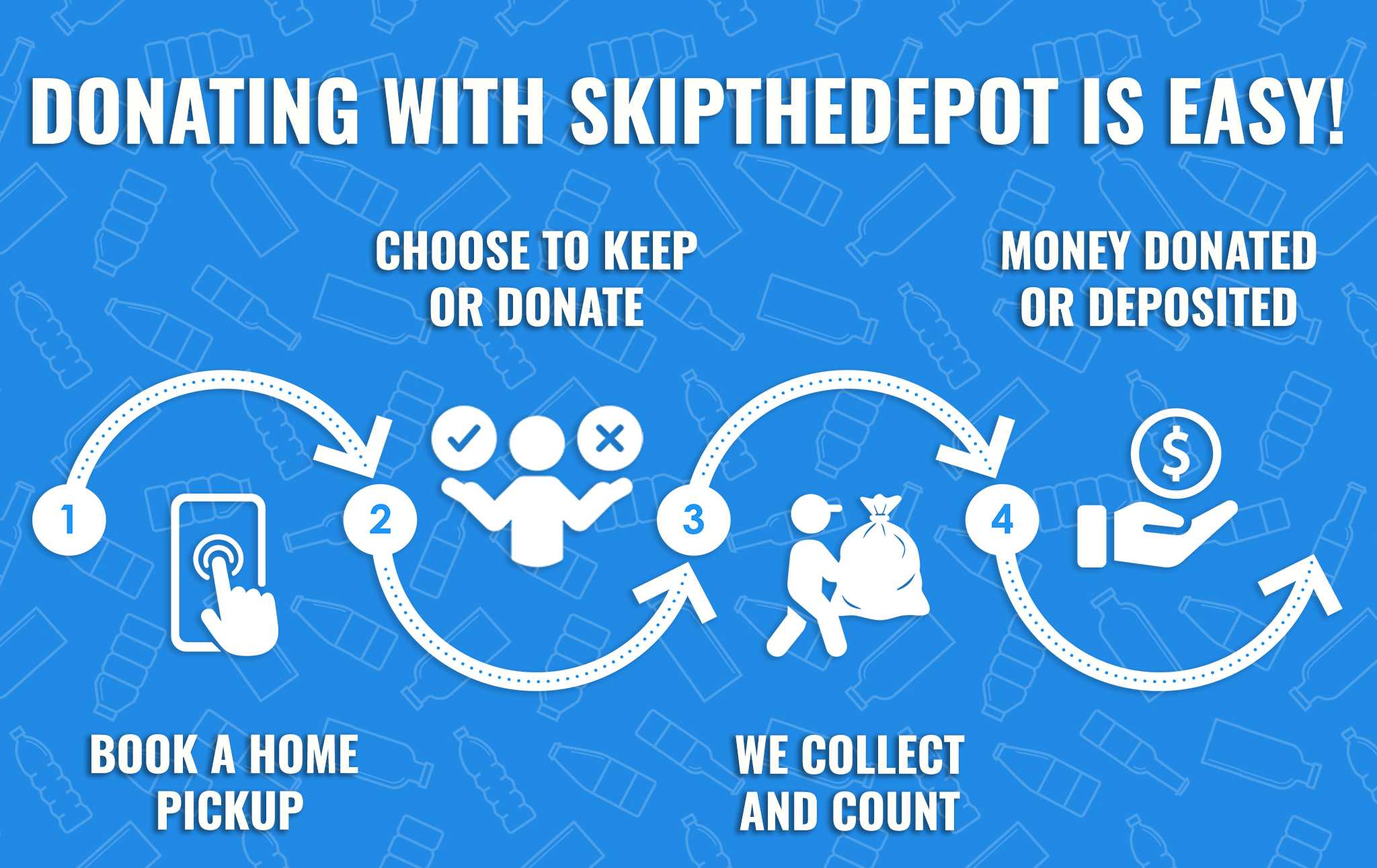 SkipTheDepot is a pickup service that collects bottles, cans, electronics, and clothing directly from your home. Refunds can be kept or automatically donated to a charity of your choice.